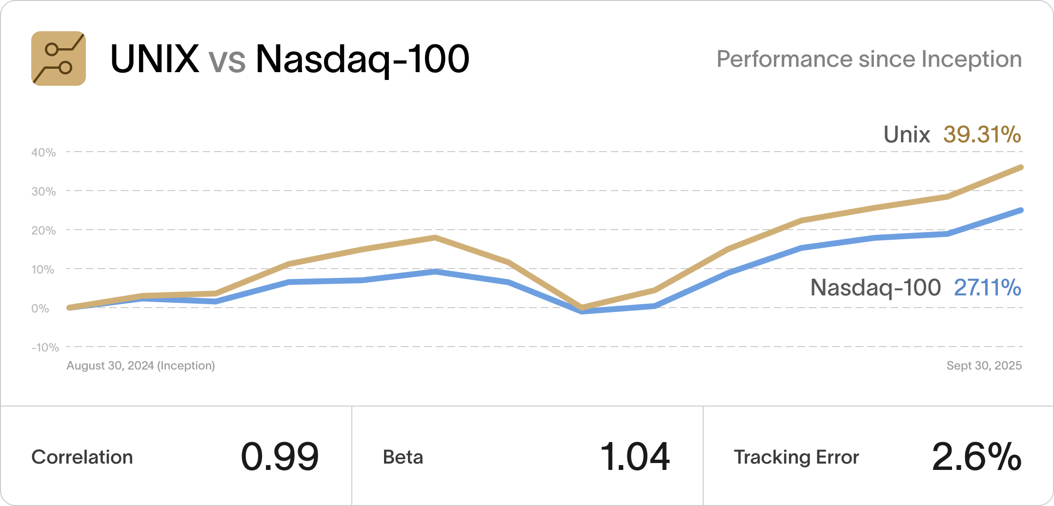 In July, UNIX executed an Index Sync transaction via AAUS to refine sector exposure and enhance tracking precision. By quarter-end, correlation to the Nasdaq-100 stood at 0.99—a hallmark of Cache’s engineering-led approach to index alignment.